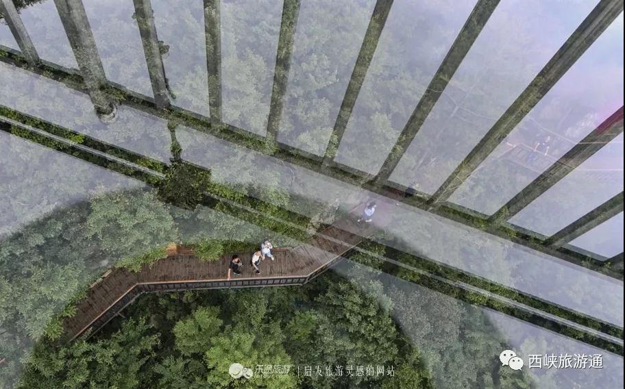 從玻璃棧道上俯瞰,曲徑通幽的木棧道在樹海中穿越,漫山遍野的連香樹、杜仲、銀杏、胡桃......清風(fēng)徐來,幽篁搖蕩,空氣中飄散著綠植的芳香。