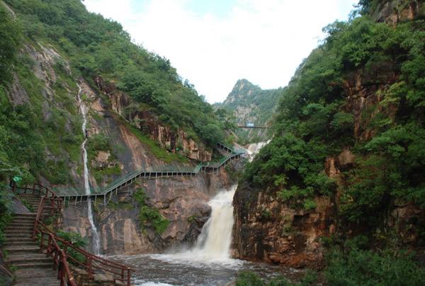 五道幢景區(qū)峽谷奇特,斷巖崢蠑,懸崖陡峭,鬼斧神工。谷中河水清澈,緩如垂練,急如拋珠,瀑瀉如注,轟鳴而下,山水相映相輝,如詩(shī)如畫;景區(qū)內(nèi)懸崖建棧道,峭壁有攀巖,峽谷有速降,吊橋空中懸,小橋伴流水,五幢勝景,各有千秋。