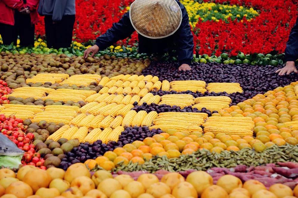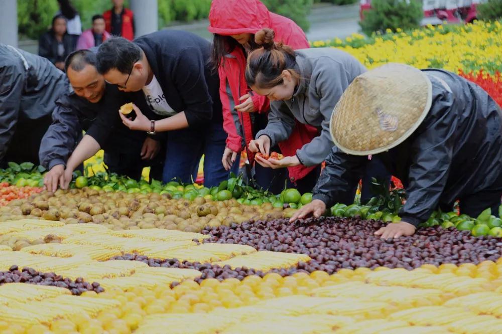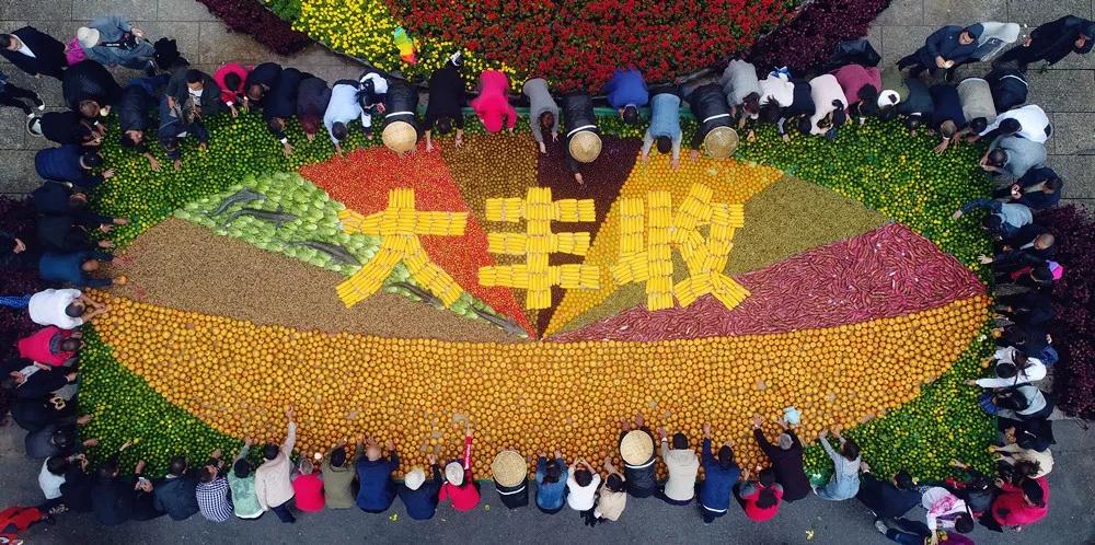 據(jù)了解,這道菜外部造型為一個“超級巨碗”,碗里盛著剛剛豐收的農(nóng)產(chǎn)品和山里的野果子,其中有煮熟的花生、毛豆,炒熟的板栗,蒸紅薯、山楂、獼猴桃、黃梨、甜柿子、生菜、玉米等,加起來總重量超過6噸,并且擺放錯落有致、色彩斑斕、精美絕倫。