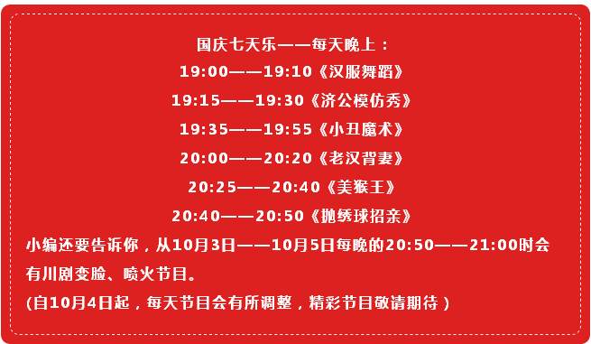 小編還要告訴你,從10月3日——10月5日每晚的20:50——21:00時會有川劇變臉、噴火節(jié)目。(自10月4日起,每天節(jié)目會有所調(diào)整,精彩節(jié)目敬請期待)