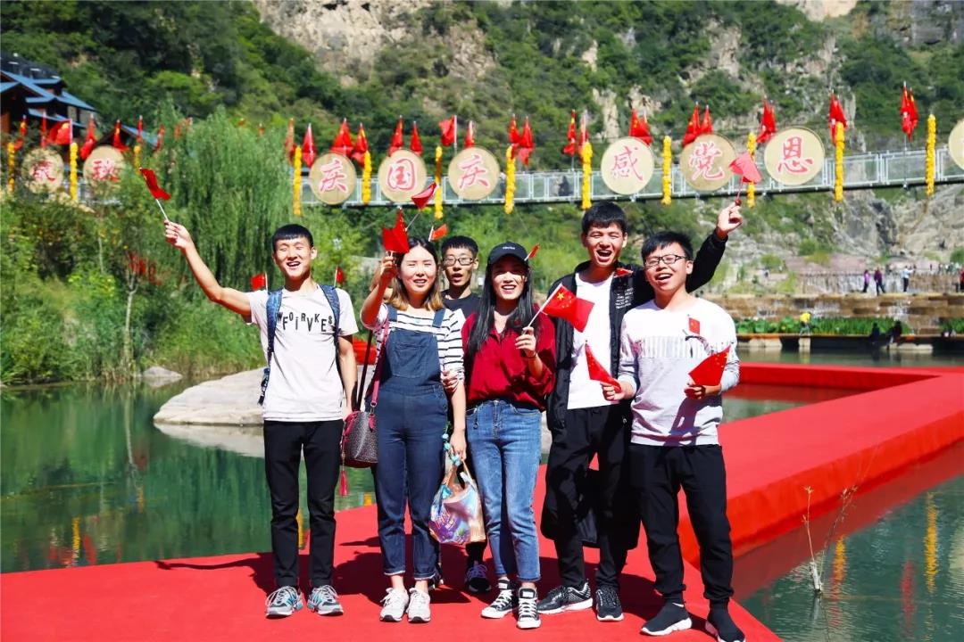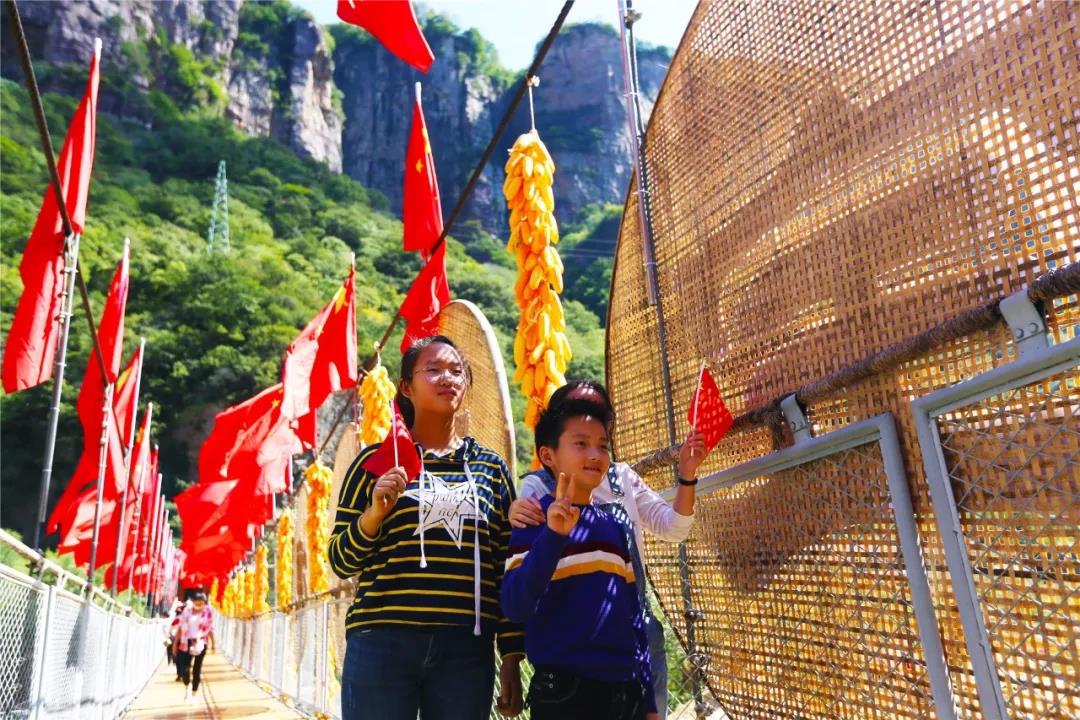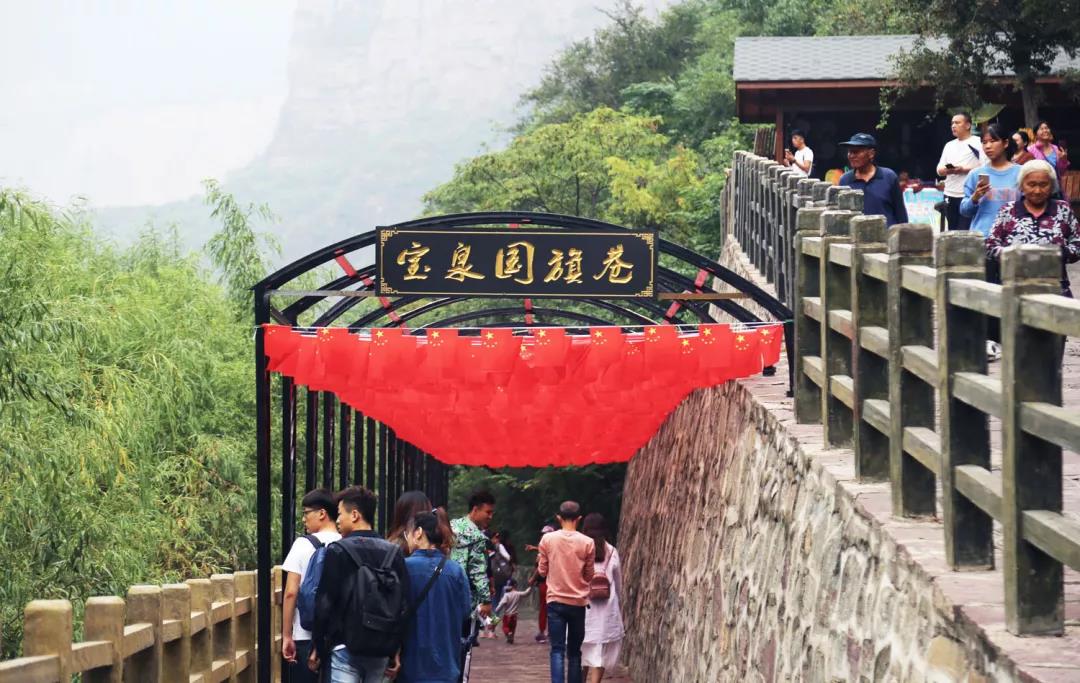 寶泉峽谷水面的棧道已鋪上紅毯,與游客臉上的國旗貼紙、手中的國旗,組成了紅色的歡慶海洋。