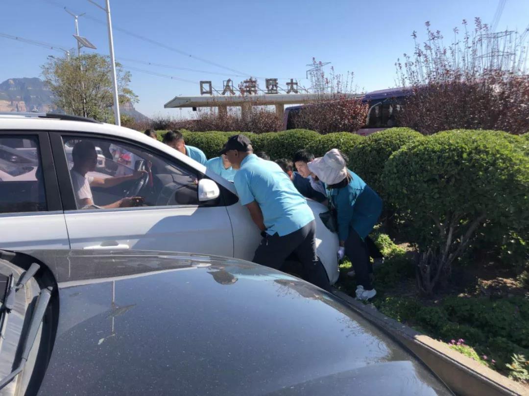 10月1日上午10點(diǎn)鐘左右,云臺山百家?guī)r停車場安全員蘇福寶在例行巡查時,發(fā)現(xiàn)一位游客不慎把車開到水道里,正一籌莫展,蘇福寶立刻叫來5名工作人員,把游客的車抬出。