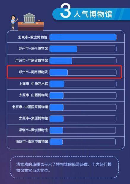 “十一”長假期間,不僅是自然風光景區(qū)人山人海,許多博物館更是人潮洶涌。10月9日,記者從微博@高德地圖了解到,在其8日發(fā)布的《2018十一黃金周國民出行報告》中,河南博物院位列“國慶”全國十大熱門博物館第四位,排名僅次于故宮博物院、蘇州博物館、廣東省博物館。據(jù)統(tǒng)計,河南博物院國慶期間共接待觀眾107054人次。登封少林寺則位列全國十大擁堵景區(qū)第二位,僅次于黃山市宏村。