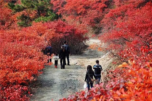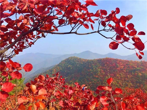 在山頂遠望,層巒疊嶂間點綴著片片紅,藍天碧水、紅葉遍地……再沒有比這更好的色彩搭配了!