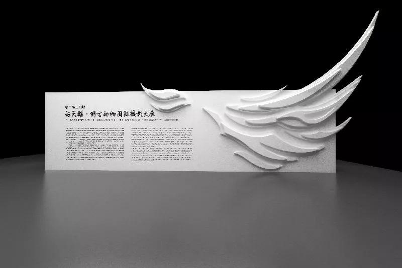 第二屆三門峽野生動物國際優(yōu)秀作品展則在設計中突出了當?shù)靥厣?mdash;—“天鵝”、設計上沒有直接使用天鵝圖像,而是運用隱喻和刪繁就簡的東方視覺語言表達,用一組展翅高飛的“翅膀”來表現(xiàn)整個展覽的主題。大面積的留白處理和整體造型純白處理,除了給人們留下豐富的想象空間,更是強調和突出了這種東方禪意所帶給人們的美學感受。