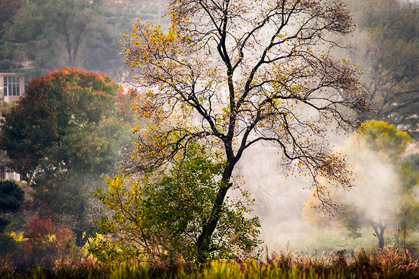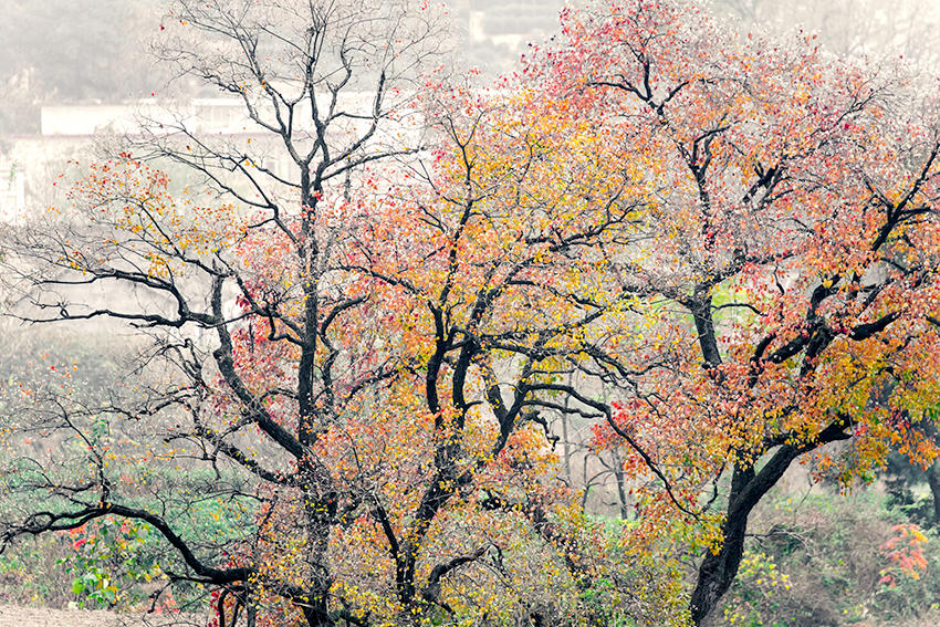 晚秋,烏桕樹葉由黃變紅,色彩鮮艷。