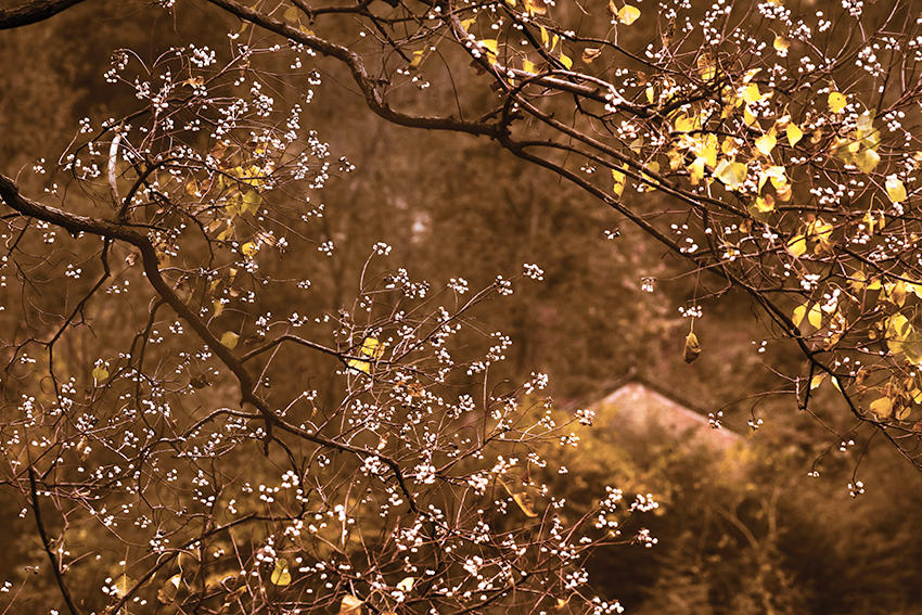 初冬,棵棵烏桕繁葉落盡,露出潔白的果實,成為大別山區(qū)一道靚麗的風景線。