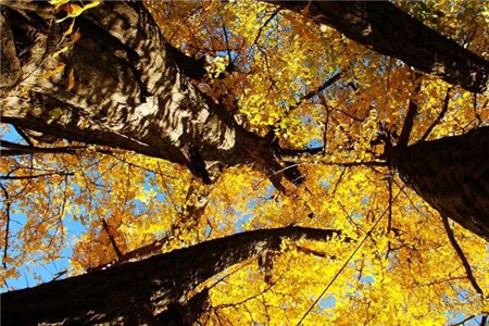 方圓數(shù)里數(shù)百株銀杏樹滿山遍野,形成了一個銀杏林,彌漫著金色輝煌和田園詩意。
