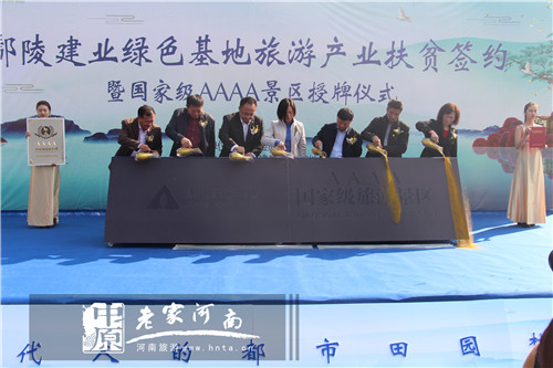 許昌市旅游局副局長吳驗兵宣讀了國家級4A景區(qū)授牌公告,隨后,主席臺領導一同上臺,將金沙導入“AAAA國家級旅游景區(qū)”啟動臺,在眾人見證之下,共同開啟了標志著鄢陵建業(yè)綠色基地璀璨未來的鎏金時刻。