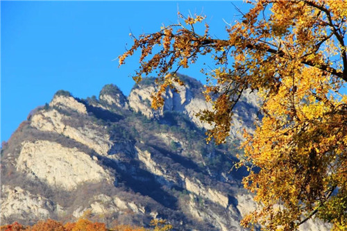 五馬寺,銀杏葉黃的最早,你看,銀杏樹的后面,就是美麗的白云山主峰白云峰...
