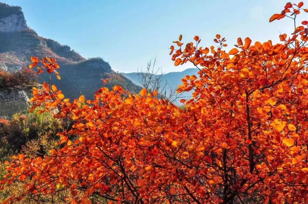 紅葉沿一座座山梁由近及遠一直延伸到遠處。幽靜的道路兩旁,斑駁的巖壁上是叢叢怒放的紅葉,或枝椏挺立,或曲折低垂。