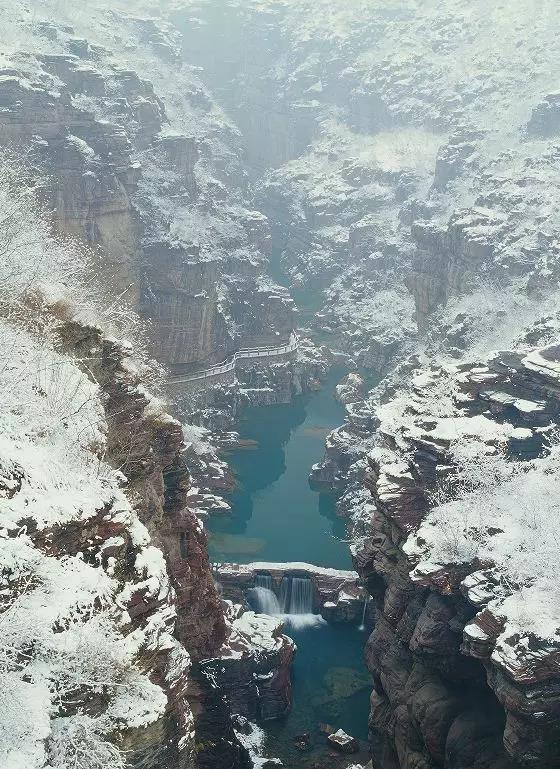 雪中的紅石峽上演兩副面孔!峽谷外,皚皚白雪,峽谷內(nèi),紅石碧水溫潤如玉~