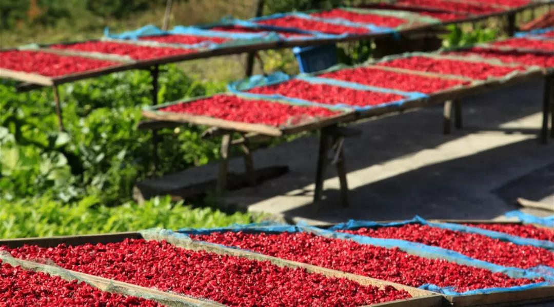 山坡河邊的石板上、農(nóng)家的房前屋后,東一團(tuán)西一片地曬著去核兒后鮮紅的山茱萸,一片片、一塊塊鋪成了紅色的海洋。