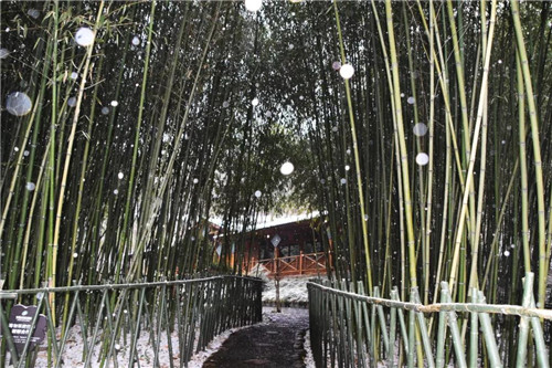 冬雪覆蓋的小屋,靜靜坐在冬日里,如癡癡守望冬天的老者,默默無聲。冬日,茂密的樹木只剩下枯枝在風(fēng)雪中孤苦的搖擺,而翠綠的竹葉卻張開嘴,去飽飲吮吸那甜如詒的晶瑩的雪花水,生機勃勃傲立在雪地上。極目遠眺,整片竹林就是玉的世界了。