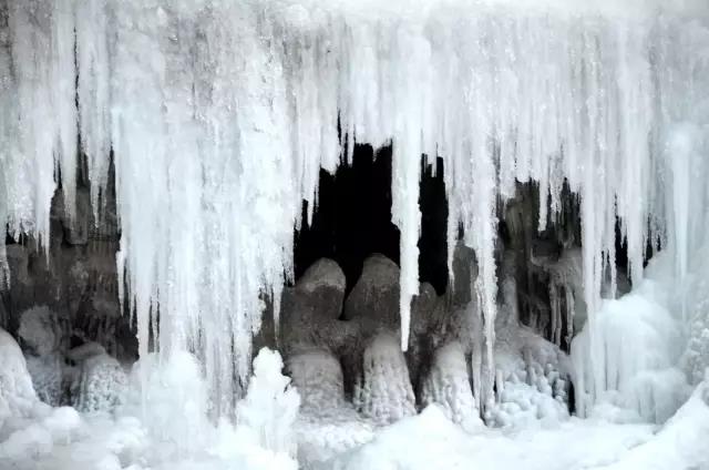 銀瀑變成了一幅巨大的天然藝術(shù)冰雕,晶瑩的冰簾以及千姿百態(tài)的冰幔冰掛,好一派璀璨耀眼的冰晶世界。流水在陽光的照射下,冰凌閃亮,水流如絲。