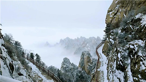 飛雪飄零,幾經(jīng)渲染,山巒上銀裝素裹,玉樹冰花,仿佛置身于高雅的水墨世界。