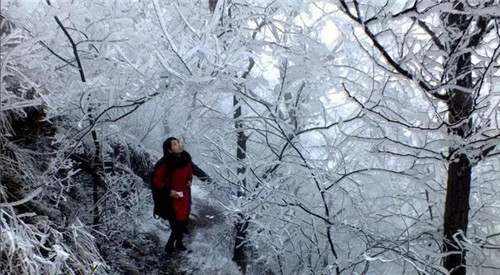 冬天的九皋山最值得期待的就是霧凇了,樹枝凝霜掛雪,戴玉披銀,如條條銀練,排排雪浪,十分壯觀。