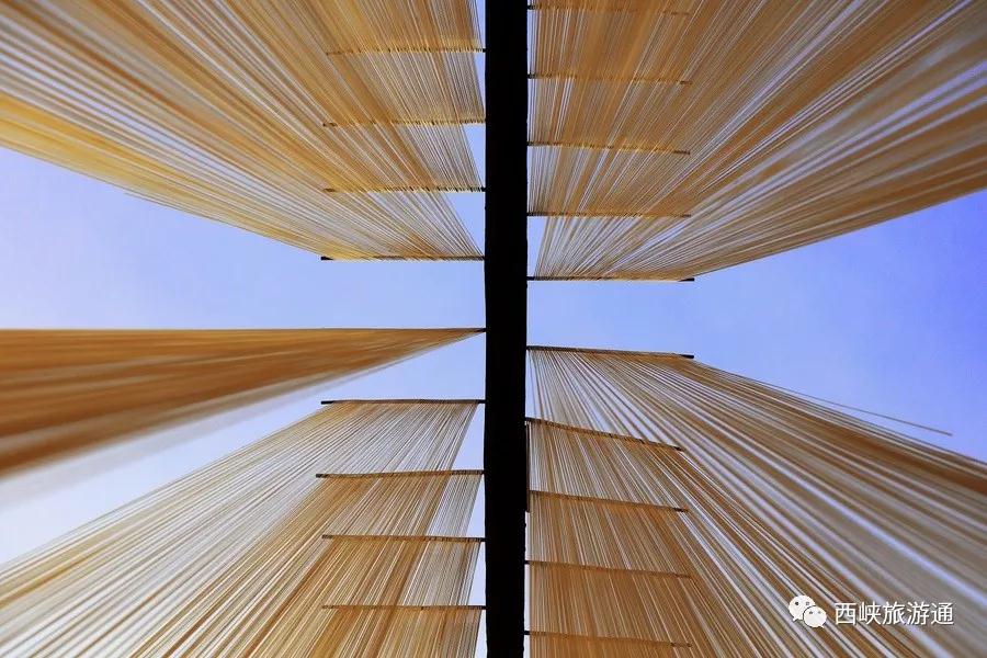 所以每年的十一月到次年的三月初,是丁河拽面制作最紅火的季節(jié)。如絲纖細(xì)的手工拽面耀現(xiàn)在村民的房前屋頂,陽光照射下,猶如銀河傾瀉,銀光閃閃。千絲萬掛,微風(fēng)吹過,輕輕搖擺。