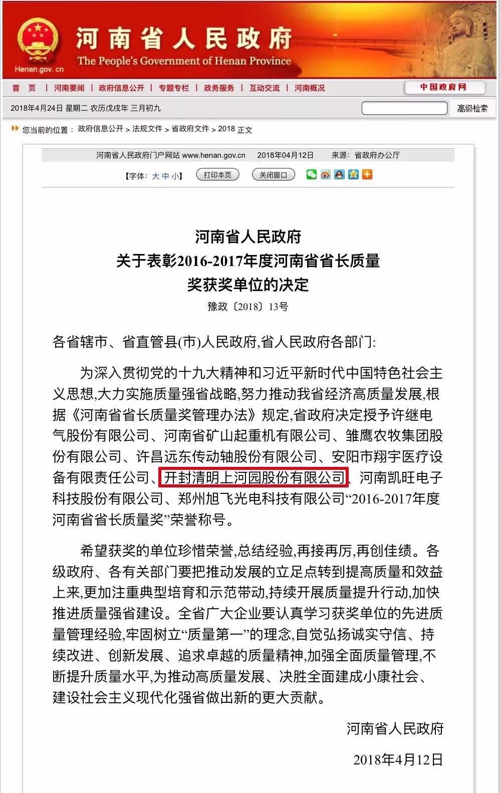 獲得2016—2017年度河南省省長質量獎。