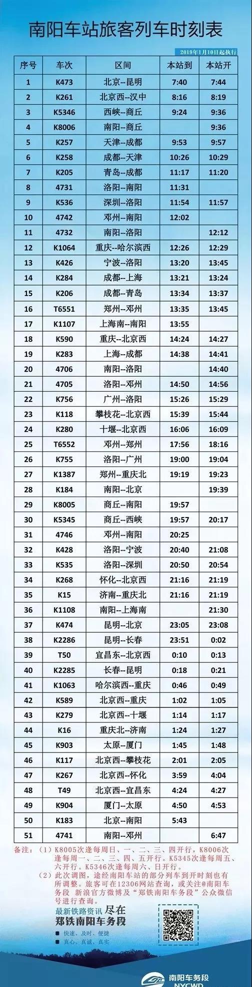 目前,鐵路部門正積極向上級申請列車恢復開行計劃。按照預測,2月份還將有部分列車相繼恢復,寧西線各趟列車也將在4月份全面恢復。結合列車恢復情況,小編對南陽站短期內(nèi)的列車時刻表進行了修正完善,希望大家惠存轉發(fā),以備不時之需。