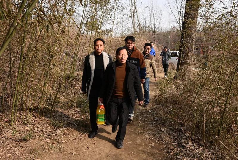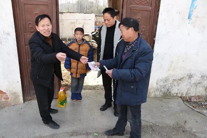 五朵山實(shí)業(yè)公司王耀萱執(zhí)行總裁、旅游開發(fā)公司聞建生總經(jīng)理走村下戶發(fā)放慰問品