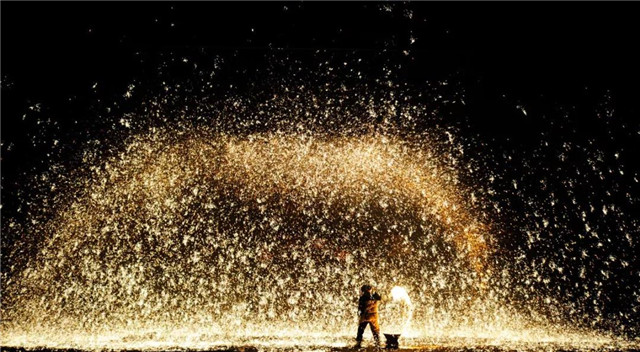 抬頭望去,一團(tuán)火焰盡情扭動(dòng),先是星星點(diǎn)點(diǎn),誘惑著觀眾,繼而鐵水溫度激增,突然間火輪飛轉(zhuǎn),火焰生風(fēng),熾熱的鐵水迅速打開,彌漫飛揚(yáng)。