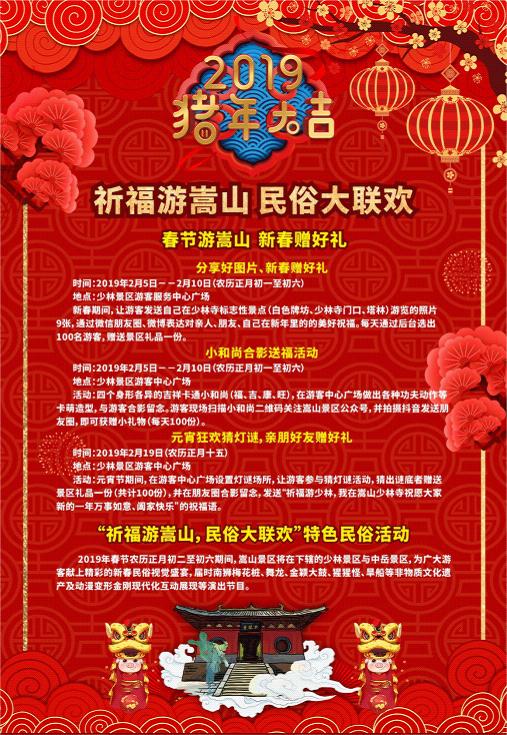 辭舊迎新時(shí),祈福好運(yùn)來(lái)。嵩山景區(qū)2019年農(nóng)歷新春將通過(guò)一系列年味十足的大型民俗活動(dòng),深度詮釋中華節(jié)侯文化的精髓,為大家描繪一幅“最中國(guó)”的盛世新春盛景圖。歡迎廣大游客和親朋好友在2019年來(lái)嵩山景區(qū)辭舊歲、迎新春!