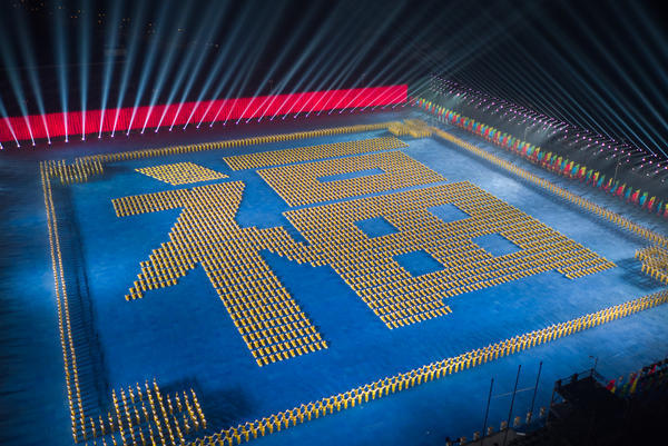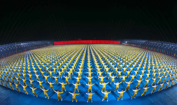 萬(wàn)人團(tuán)體操?gòu)墓?jié)目改編到演員的選拔組織,再到拍攝現(xiàn)場(chǎng)的布置都傾注了河南武術(shù)人的心血。
