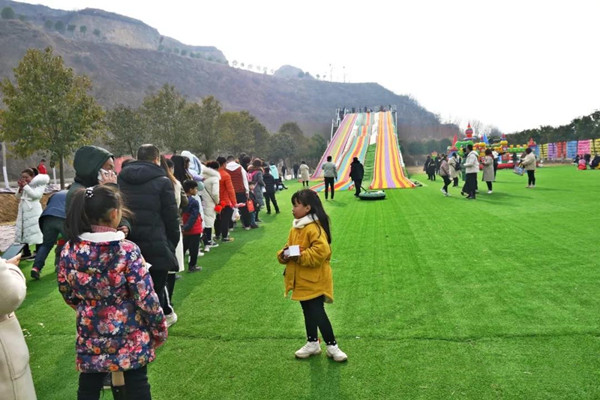 七彩滑道排起一條長長的隊(duì)伍,井然有序