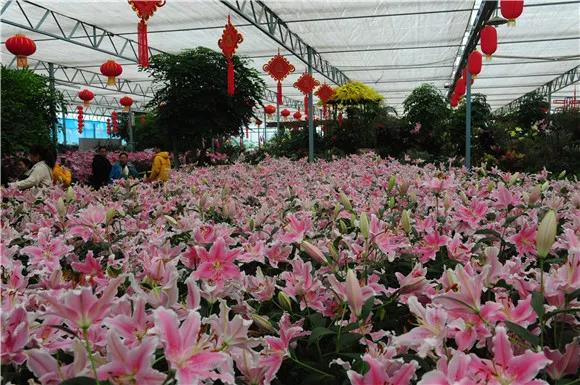 4000平方米智能溫室內,近六萬株、30個品種的百合花絢爛綻放。紅、黃、粉、橙,色彩明艷,香氣撲鼻,吸引了不少游客朋友拍照留念。