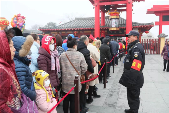 春節(jié)期間,清明上河園全體員工上崗,除了在崗的一線員工,其余員工都要在門前進行引導。