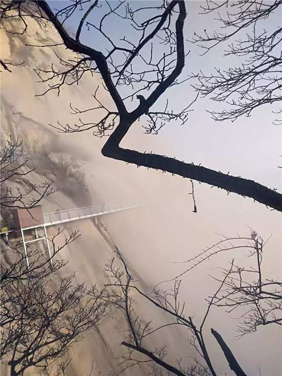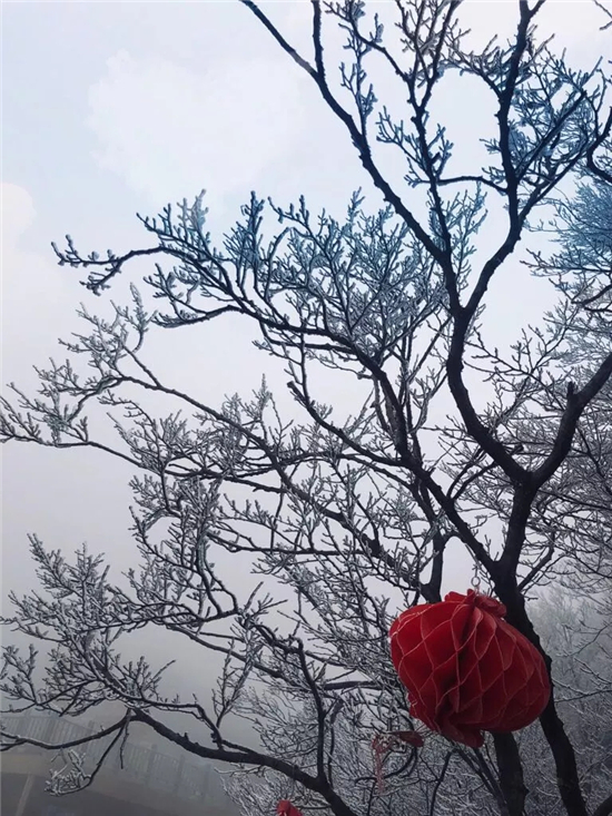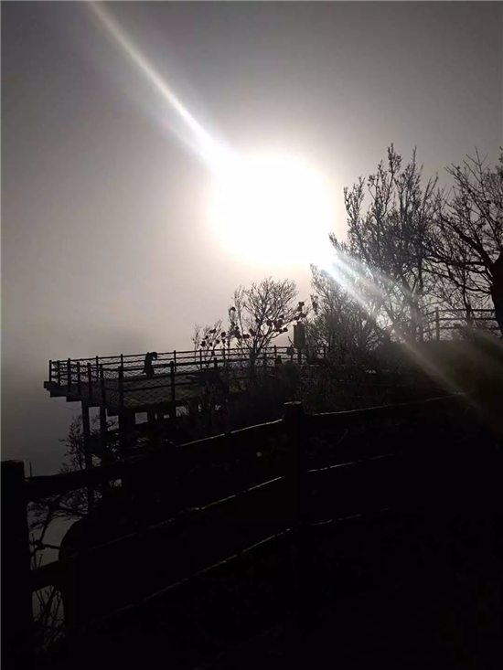 大年初三上午,五朵山驚現(xiàn)奇特景觀。山的西面冷風(fēng)凄緊、陰霾沉沉、霧凇高掛,山的東面云海茫茫間一輪紅日噴薄而出......