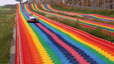 一百多米的滑道,波瀾起伏,宛如鮮艷的彩虹,從高處傾瀉而下;郎熟n麗,老少皆宜,動感十足。尖叫、刺激、歡呼,過癮!看著這圖就覺得好玩又刺激。