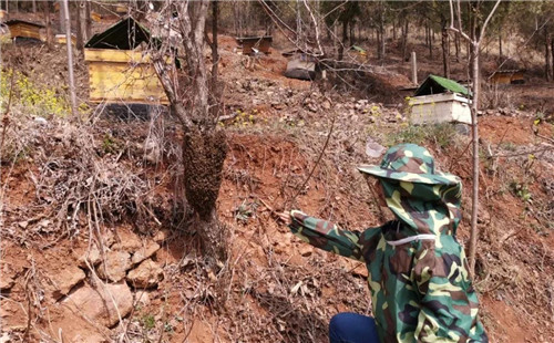 在老薛的蜂場,我們意外目睹了難得的蜜蜂分巢全過程,前后幾分鐘時間,在蜂王的帶領(lǐng)下,一個蜂箱內(nèi)的部分中蜂跟隨蜂王落在附近的樹上。薛嬸兒拿一把竹濾刷上蜂蜜把所有落在樹上的蜜蜂收回到新的蜂箱里。