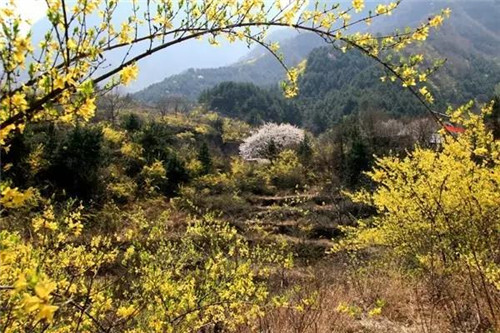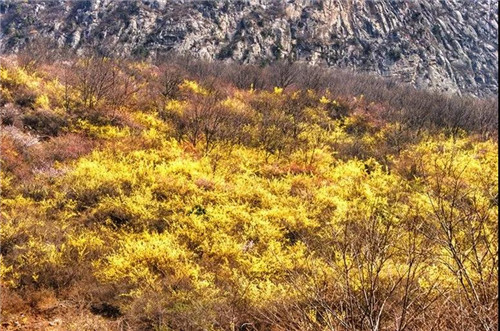 三月下旬,花期一到,競相開放的連翹花把關山裝扮成金色的海洋。