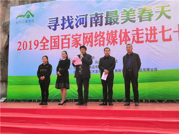 4月3日,方城縣七十二潭景區(qū)旅游推介會如期舉行,助力打造方城特色文化旅游品牌。方城縣旅游領導小組副組長、縣政府黨組成員侯金耀、方城縣文化廣電和旅游局局長譚政、七十二潭景區(qū)董事長王國華出席推介會并發(fā)表講話。由方城縣人民政府主辦,方城縣文化廣電和旅游局、鳳凰網(wǎng)河南頻道承辦的“2019全國百家網(wǎng)絡媒體走進方城”活動第二站來到美麗的七十二潭,繼續(xù)“尋美”方城,深入探訪有“中華第一石川”之稱的七十二潭景區(qū)。