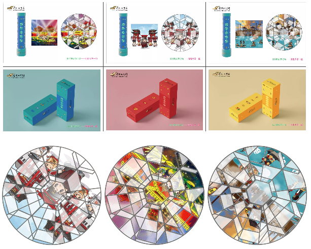 設(shè)計思路:“萬花”與“萬華”同音并能突出宋代東京夢華的繁榮感,而“華”字具備美好華麗的意思,萬華則具備著美好繁華的期許。將萬花筒功能與畫軸造型結(jié)合,使產(chǎn)品具備藝術(shù)、教育、游戲、科學(xué)為一體的產(chǎn)品效果。
