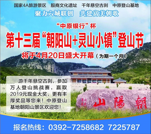 聚力六城聯(lián)創(chuàng),共建富美朝歌。 “中原銀行”杯第十三屆 “朝陽(yáng)山+靈山小鎮(zhèn)”登山節(jié)將于4月20日(本周六)盛大開(kāi)幕。此次活動(dòng)由鶴壁市教育體育局、共青團(tuán)鶴壁市委、淇縣人民政府、鶴壁市戶外登山運(yùn)動(dòng)協(xié)會(huì)主辦,淇縣教育體育局、共青團(tuán)淇縣縣委、淇縣文化廣電和旅游局、靈山街道辦事處、伊展傳媒聯(lián)合承辦,是朝陽(yáng)山景區(qū)和靈山小鎮(zhèn)聯(lián)袂打造的年度性登山活動(dòng),旨在進(jìn)一步引導(dǎo)生態(tài)旅游的理念和健康時(shí)尚的生活方式,通過(guò)體育品牌賽事與旅游景區(qū)的深度融合發(fā)展,大力推廣全民健身運(yùn)動(dòng),讓專業(yè)賽事越來(lái)越貼近大眾生活,讓“旅游+體育”格外出彩,屆時(shí),全民健身登山挑戰(zhàn)賽、文藝節(jié)目展演等旅游活動(dòng)精彩紛呈。