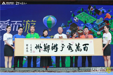 老胡在啟幕儀式上親自為活動(dòng)題詞“百萬(wàn)客戶(hù)游鄭州”,并攜5位業(yè)主代表一道在題詞上蓋下印章,宣告了建業(yè)集團(tuán)“因愛(ài)而游·建業(yè)百萬(wàn)客戶(hù)游鄭州”活動(dòng)正式啟動(dòng)。