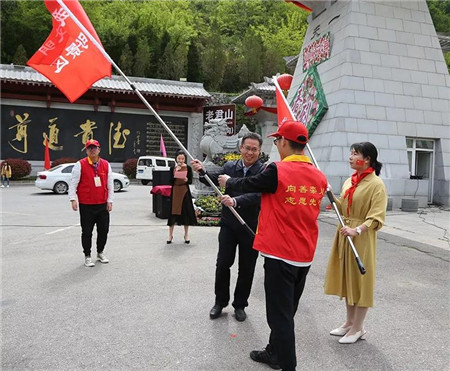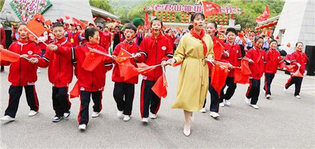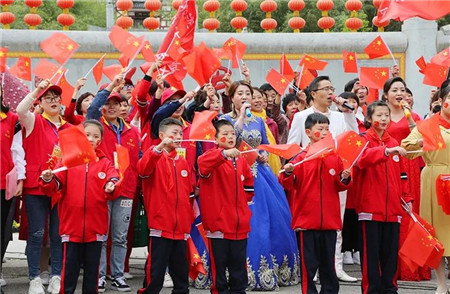 活動現(xiàn)場,由學(xué)生團員、老年大學(xué)退休黨員和游客組成的志愿者隊伍耍起了快閃秀《歌唱祖國》,以此方式向無數(shù)為祖國建設(shè)默默付出的勞動者致敬,向偉大的祖國致敬。參演者手中揮舞著五星紅旗,瞬間把演出廣場變成了紅色的海洋。與此同時,嘹亮歌聲響徹整個山谷,感染著在場的每一位觀眾。