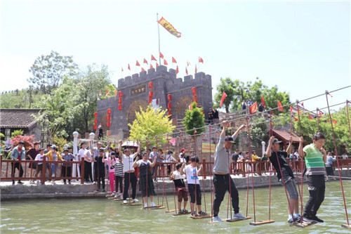 在傳統(tǒng)古村落趙莊,來自各地的游客朋友們漫步特色小吃街,打卡網(wǎng)紅晃晃橋、空中索橋、懸崖秋千、水上漫步等特色游樂項(xiàng)目,徒步穿越地谷嶺、朝歌寨,徜徉青山綠水間,感受戶外登山的無限樂趣。
