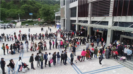 一大早,洛陽白云山游客服務中心大廳就擠滿了游客,白云山及時啟動旅游接待應急預案,各部門全力以赴投入接待服務。在工作人員引導下,游客服務中心大廳外的廣場有序排起三條游客長龍,游客們排隊依次購票換乘入園。