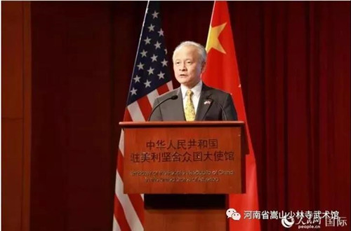 少林寺武術(shù)館副館長陳俊杰(左二)與崔天凱大使在開放日活動(dòng)現(xiàn)場