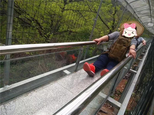走了玻璃棧道,從一開始的慌張,到現在的淡定,新鮮勁大不如前了吧,哼,早就料到了,別急,我們還有絕招-----玻璃滑道!