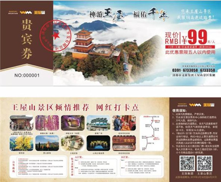 2019年5月18日至2019年8月31日,為慶祝王屋老街盛大開(kāi)園,王屋山景區(qū)鉅惠不斷,限量貴賓券免費(fèi)送!憑貴賓券游覽王屋山景區(qū)享通票99元/人(原價(jià)200元),且每張貴賓券可五人以?xún)?nèi)使用!