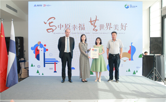 接下來,芬蘭駐華大使肅海嵐、中芬創(chuàng)新美好生活方式研究協(xié)會秘書長陸斐、建業(yè)地產(chǎn)助理總裁兼足球小鎮(zhèn)項目總經(jīng)理劉堉共同完成建業(yè)中原文化小鎮(zhèn)之櫻桃溝足球小鎮(zhèn)《中芬創(chuàng)新美好生活方式研究協(xié)會官方研究基地》授牌儀式。