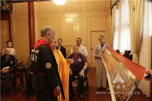美國少林武藝中心代表團領(lǐng)隊大衛(wèi)向大家展示自己第一次前來少林寺歸山的珍貴照片,感謝了永信方丈的慈悲開示及少林武僧的精彩展演,并表示,此行學員為首次乃至十多次親自前來,感受禪武醫(yī),感受少林魅力,來少林寺是大家從小的夢想,感謝少林寺把少林文化保護傳承的這么好。