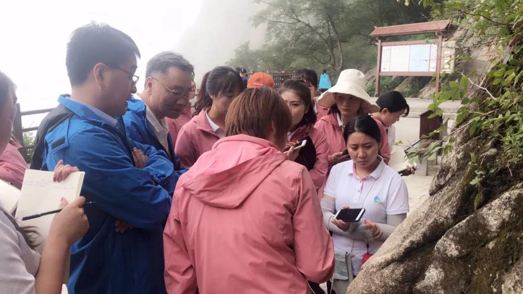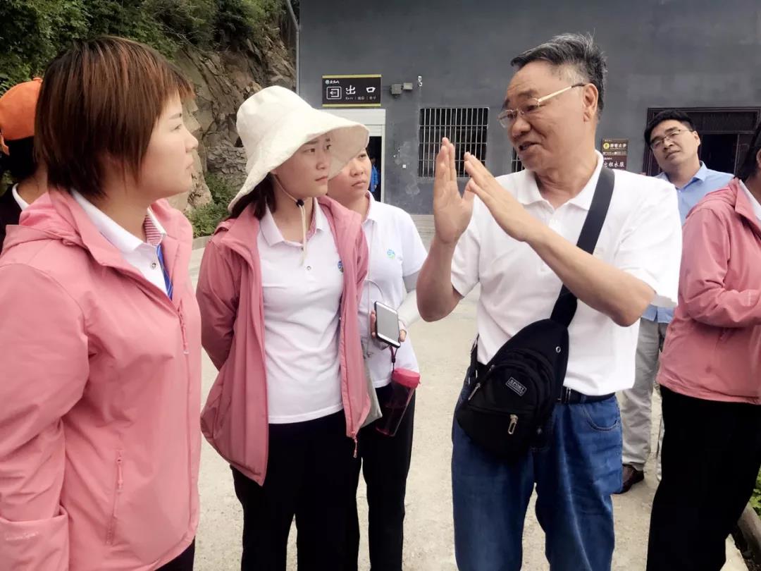 下午,兩位專家?guī)ьI景區(qū)講解員進行實地考察,傳授和講解關(guān)于地質(zhì)地貌、人文歷史等一系列知識,并現(xiàn)場分析解說老君山花崗巖的形成過程和形成原理。