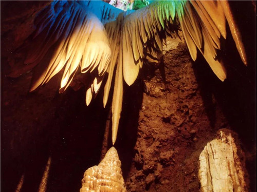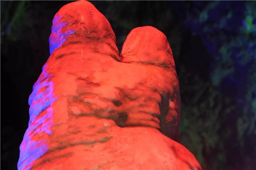 被譽(yù)為“北國(guó)第一洞”的雞冠洞,是一座飽含八億年色彩的地下宮殿,神秘的地殼運(yùn)動(dòng)造就了現(xiàn)在一幅瀉靈溢韻的水墨丹青。在這座天然形成的溶洞中,有一組獨(dú)特景觀“一吻千年”.“千年一吻”。