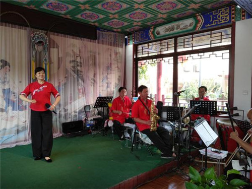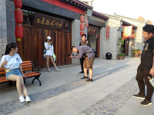 置身青磚灰瓦、雕梁畫棟的仿古建筑之間,文旅創(chuàng)作團隊仿佛有種時空穿越的感覺,只是還來不及感受,身旁的雕像上已被黃昏的光線鑲上了一道金邊,視頻創(chuàng)作團隊立刻抓住這轉(zhuǎn)瞬即逝的光投入到新一輪的創(chuàng)作中。這里太陽甫一下山,那里此起彼伏的唱戲聲又吸引了大家的注意,于是創(chuàng)作團隊轉(zhuǎn)戰(zhàn)偃月古城劇戲曲廣場,在吹拉彈唱間一陣清脆的快門聲響起。